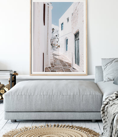 The Whitewashed Paros Alley Print features a classic white and blue street in Paros in the Greek Islands and is part of our stunning Greece collection.